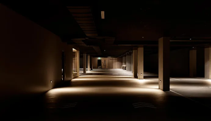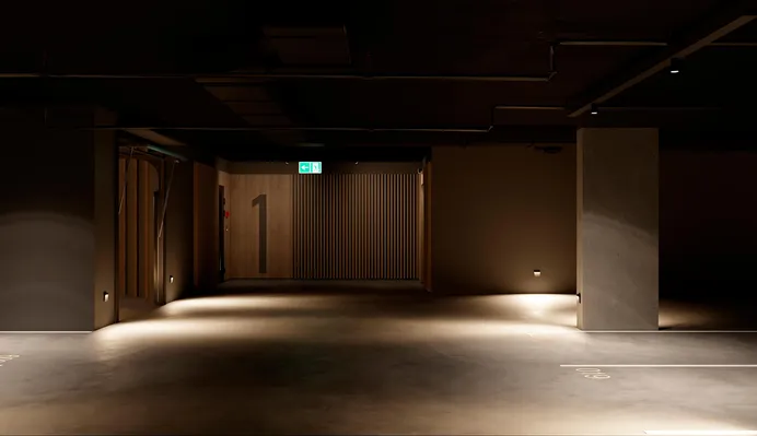 Подземный одноуровневый паркинг рассчитан на 99 машиномест. Мы относимся к подземному паркингу, как к альтернативной входной группе. Поэтому в его оформлении использованы те же материалы, что и в холлах. В уровне паркинга также расположены колясочные и велосипедные комнаты.