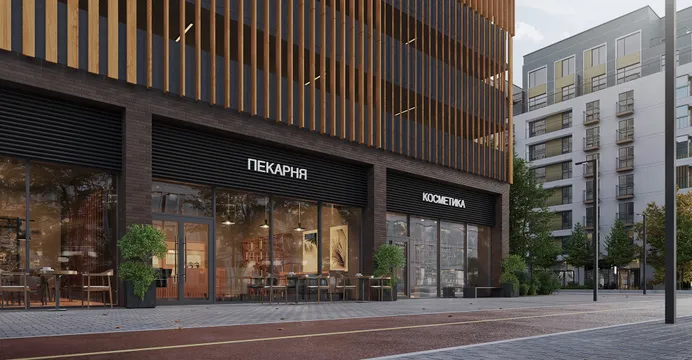 Здание выглядит лаконично и современно. Фасад облицован деревянными ламелями — такой элемент природного декора помогает проекту вписаться в городскую среду.