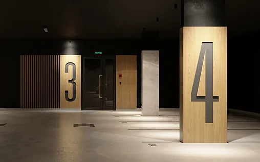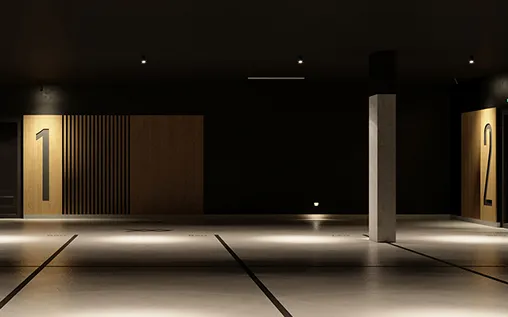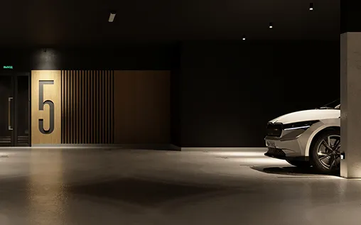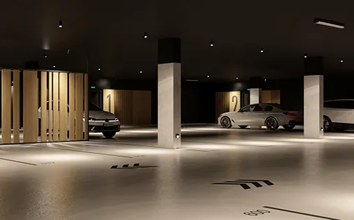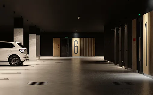 В домах предусмотрены подземные паркинги. В их отделке мы применили материалы аналогичные по текстуре и цветам тем, что использованы в подъездах, и таким образом ещё раз подчеркнули равноценность всех мест общего пользования. Мы «спрятали» инженерные сети, окрасив в тёмные тона стены и потолки. Чтобы сделать пространство более приветливым и эстетичным, добавили тёплый интерьерный свет и декоративные перегородки. Помимо машиномест в каждом мы спроектировали кладовые и помещения для хранения колясок, снегокатов, санок и велосипедов.